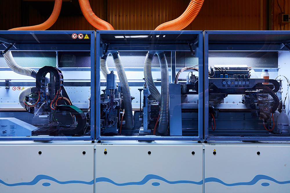 The cross-section of particle boards and MDF in places exposed to contact with the user must be secured. Currently, ABS tapes with a thickness of 0.5 mm to 2 mm are most often used for veneering, but it is possible to use other materials such as HPL laminate, veneer or solid wood. The whole process, from cleaning and levelling the edges, to cleaning the element after veneering is completely automated and made on machines that we have designed based on our decades of experience.