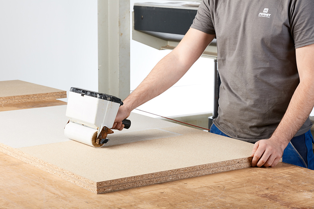 Press veneering consists in compressing, under high pressure, a furniture board (usually chipboard or MDF) with natural veneer, modified or HPL laminate on a high quality hydraulic press with the use of water-based adhesives.