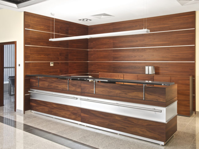Biuro, HPL, Mat. naturalne, Przestrzeń publiczna, Recepcja, Ściana, Szafa, Tapicerka
